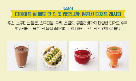 고단백와플, 프로틴티라미수, 머그컵프로틴케이크, 프로틴그래놀라, 다이어트바나나푸딩, 허니버터두부칩, 말차그릭베이글, 초코그릭크림토스트, 프로틴아이스크림, 프로틴밀크푸딩, 석류콜라겐젤리, 딸기프로틴퐁듀, 수제그릭요거트, 리코타치즈, 다이어트누텔라, 두부치즈, 두부마요네즈, 다이어트피클, 요거트코울슬로, 오이초무침, 당근라페, 콜라비쏨땀