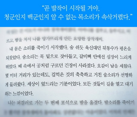 내 몸은 소리를 죽이기 시작했다. 숨 쉬듯 욱신대던 뒤통수가 평온을 되찾았다. 숨소리는 목 밑으로 잦아들고, 갈비뼈 안에선 심장이 느리게 뛰었다. 배 속에서 공처럼 구르던 긴장이 사라졌다. 오감이 날을 세웠다. 몇 미터 거리가 있는데도, 겁먹은 것의 축축하고 거친 숨소리가 선명하게 들려왔다. 세상이 엎드리는 기분이었다. 모든 것들이 길을 열고 대기하는 느낌이었다._ 본문 283쪽