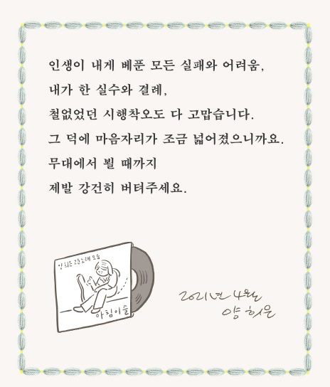 “인생이 내게 베푼 모든 실패와 어려움, 내가 한 실수와 결례, 철없었던 시행착오도 다 고맙습니다. 그 덕에 마음자리가 조금 넓어졌으니까요. 무대에서 뵐 때까지 제발 강건히 버텨주세요.” _〈에필로그〉(243p)