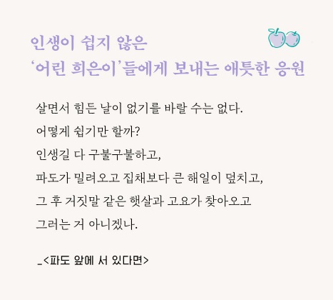 “너무 힘든데 어떻게 살아야 할까요?” 먼저 인생을 살아온 자신이 ‘어른’으로 보였을 이들에게 답변을 건네기 위해 조심스럽게 말을 고른다. 그저 누군가 건넨 “작은 손길”에도 살아보기를, 파도를 지나 “거짓말 같은 햇살과 고요”를 만나기를. 인생이 쉽지 않은 세상의 많은 ‘어린 희은이’들에게 애틋한 응원을 보낸다.