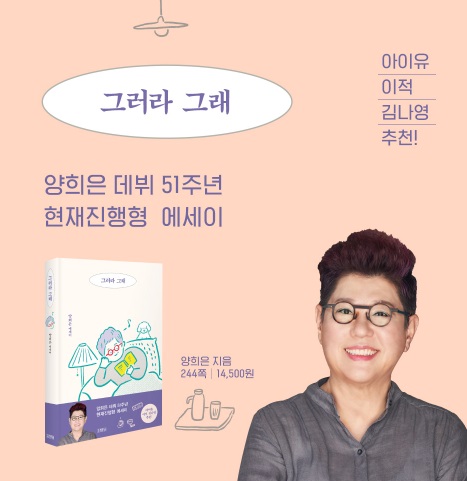 데뷔 51년 차에도 한 그루 느티나무처럼 늘 같은 자리에 서서 세월만큼 깊어진 목소리로 노래하는 현재 진행형 가수 양희은의 에세이 《그러라 그래》가 출간되었다. 지나온 삶과 노래, 일상의 소중한 순간들을 마치 오랜 친구의 사연을 낭독하듯 따스하고 정감 있게 담았다.