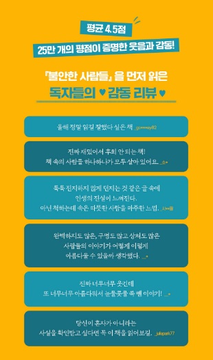 『불안한 사람들』은 이전의 배크만 작품과도 다른 독특한 지형을 지닌다. 하나의 강렬한 캐릭터가 주도적으로 이끌어가기보다는 개성이 제각각인 여러 명이 유기적으로 촘촘히 연결되어 있는 이야기라는 점에서 실제 인생과 더욱 닮아 있다. 또한 인간의 필연적인 불안과 고독을 이야기하면서도 섬세함과 유머를 잃지 않는다. 이제 독자들은 자신의 가장 큰 장기를 너무나 잘 알고 능숙하게 활용하는 배크만이 선사하는 선물 같은 장면들을 음미할 일만 남았다.
