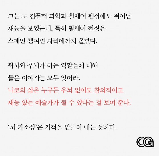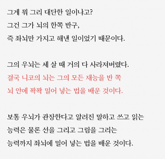 빈 서판. 라틴어로 타불라 라사(tabula rasa)라 부르는 이 말은 인간은 태어날 때 새하얀 도화지이며, 태어난 후 각종 경험을 통해 마음과 지성이 형성된다는 이론이다. 이 빈 서판 이론은 오랫동안 교육학에서 사상적 기반으로 유지됐다. 그런데 이 이론대로라면 아이가 너무 어릴 적부터 어느 한 감각을 잃어서 경험하지 못한다면 그 아이는 아무런 지성도, 감성도 발휘할 수 없어야만 한다. 세계적인 인지신경과학자 스타니슬라스 드앤은 브라질에서 만난 소년 펠리페와의 일화를 통해 자신의 생각을 과감히 수정하게 되었다. 펠리페는 네 살 때, 거리에서 총격을 당했다. 총알은 소년의 척수를 관통하여 거의 전신마비 상태로 살 수밖에 없게 되었다. 심지어 총알이 시각을 관장하는 뇌 부위를 파괴하여 시력마저 잃고 말았다. 그러나 펠리페는 활력이 넘치고, 포르투갈어, 영어, 스페인어를 능숙하게 사용하며 좀 더 많은 어휘를 배우려고 했다. 누가 가르쳐준 것도 아닌데 상상력을 발휘하여 의료진의 도움을 받아 자신만의 소설을 쓰기도 했다.