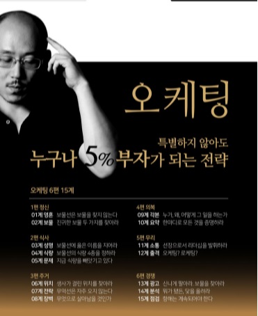 저자가 상위 1% 부자가 되기까지의 여정을 함께하다 보면 어느새 성공으로 향하는 길이 보인다. 특히 오케팅하는 방법을 보물선 항해에 빗대어 풀어내 누구나 쉽게 익히고 실천할 수 있도록 했다. 이 책은 오케팅을 실생활뿐만 아니라 모든 곳에 적용해 성공할 수 있는 사고력을 길러 준다. 직업이나 성별, 나이에 무관하게 누구나 읽고 배우는 데 막힘이 없어 삶의 질을 높이고 싶은 모든 이에게 희망을 선사한다.