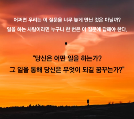 일을 잘하기 위한 방법과 매뉴얼은 넘쳐날 만큼 지천에 깔려 있다. 사람들은 어떻게 해야 성과를 내는지, 어떻게 해야 가장 빨리 목표에 도달할 수 있는지 끊임없이 탐구하고 공부하며 ‘일을 더 잘하기 위해’ 부단히 애쓴다. 그러나 단 한 번도 ‘왜 일을 하는 것인지’ 스스로에게 묻거나 그 답을 찾는 사람은 없다. 일에 대한 확신과 이유가 없으니 약간의 미풍에도 뿌리 없는 나무처럼 이리저리 흔들린다.