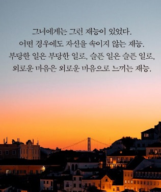 나는 할머니의 얼굴을 들여다봤다. 할머니는 나와 우리 엄마의 이름을 말하고 있었다. (…) 우리는 언덕 위에 어색하게 서서 서로를 바라봤다. 할머니의 얼굴에 장난스러운 표정이 떠올랐는데, 나는 할머니가 처음부터 나를 알아봤다는 생각을 했다. “할머니.” 내 말에 할머니는 고개를 끄덕였다. “오랜만이야.”(20~21쪽)
