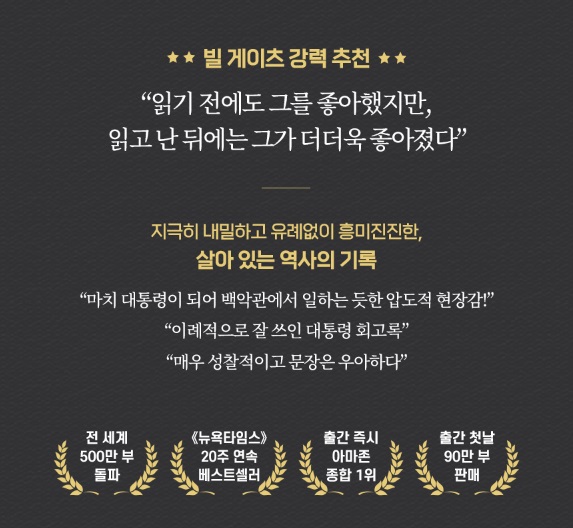 덕분에 우리는 오바마가 내각을 꾸리고, 세계 금융 위기로 씨름하고, 블라디미르 푸틴의 심중을 떠보고, 불가능하게만 보이던 부담적정보험법(오바마케어)을 통과시키고, 아프가니스탄 문제를 두고 장군들과 논쟁하고, 월 스트리트 개혁을 위해 분투하고, 딥워터 호라이즌호 폭발 사고에 대응하고, 넵튠의 창 작전을 승인하여 오사마 빈라덴을 사살하고…… 이 모든 과정에 함께하며 어떤 내막이 있었고 무슨 생각을 했는지 백악관 내부뿐 아니라 대통령 개인의 내면까지 가까이 들여다보게 된다.