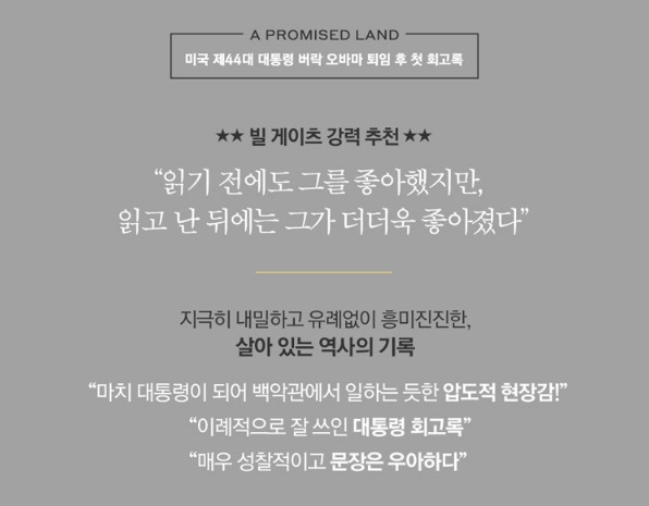 그가 서두에서 밝힌바 “이 모든 이야기를 500쪽 안에 담을 수 있을 줄 알았다. 1년이면 다 쓸 거라 예상했”지만, 책은 결국 두 권으로 나뉘었고 『약속의 땅』은 그중 1권이며 920쪽에 달한다. 압도적 두께는 제 값을 하고도 남았다. 흥미진진한 사건과 치밀한 디테일과 우아한 문장이 어우러진 이 책에 언론과 평단은 “최고의 대통령 회고록” “유례없이 잘 쓰인 책” “현실 정치의 진면목을 보여주는 책” 등의 찬사를 쏟아냈다. 빌 게이츠는 마치 소설처럼 읽힌다며 “끝내주는 읽을거리”로 강력 추천했다.