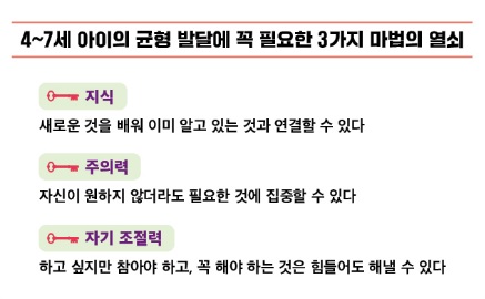 4~7세 아이의 부모는 아이를 잘 키우기 위해 반드시 한 가지 기준을 세워야 한다. 바로 정서와 인지의 균형 발달이다. 어려운 수학 문제를 척척 풀지만 독불장군인 4세 아이, 밝고 예의가 바르지만 친구들이 다 아는 것을 혼자만 모르는 7세 아이… 이렇게 불균형이 일어나면 부모는 혼란스럽다. 아이의 부족한 점만이 커 보여 마음이 균형을 잃고 한쪽으로 치우치기 시작한다. 주변에 휩쓸려 한글, 영어, 수학 등을 가르치는 쪽으로 쏠리기도 하고, 공부보다는 건강하고 행복하게 자라는 것이 더 중요하다고 생각해 일부러 놀게 내버려두기도 한다. 그러나 이처럼 편중된 육아 신념이 궁극적으로 아이의 정서와 인지 발달에 불균형을 일으켜 결국엔 전혀 예상치 못한 문제가 발생하게 된다는 사실을 알아야 한다. 경쟁 때문에 공부를 시켜야 하는 것이 아니라, 아이의 안정된 정서와 인지 능력의 발달을 위한 공부가 필요하다는 의미다. 즉, 안정된 정서를 기반으로 배움이 본격적으로 이뤄지는 결정적 시기가 바로 4~7세이며, 저자는 이 시기 아이들이 정서와 인지를 균형적으로 발달시키려면 ‘지식, 주의력, 자기조절력’이라는 3가지 마법의 열쇠가 꼭 필요하다고 강조한다.