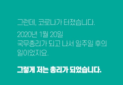 어쩌다 국무총리 | 대구에 가자 | 임시병동을 찾아라 | 총리인가 과장인가 | 마스크 5부제 | DUR 시스템 | 국가의 품격 | K 방역 | 유엔참전용사에게 마스크를 | 일본도 돕자 | 위기 속에서 치러진 총선거 | 국경봉쇄에 대하여 | 고통의 무게는 평등하지 않다 | 코리아 프리미엄 | 많이 괴로웠지요 | 이번 추석엔 총리를 파세요 | 종교계, 고맙습니다 | 누가 먼저 골인하느냐 | 손실보상제도의 입법화