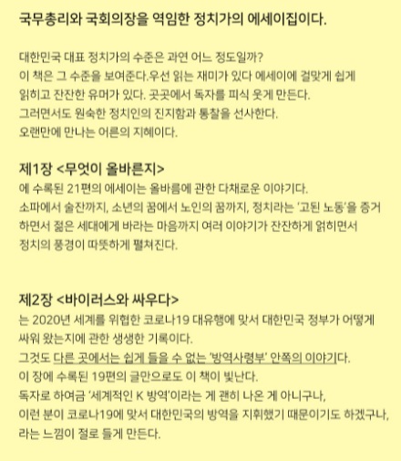 국무총리와 국회의장을 역임한 정치가의 에세이집이다. 대한민국 대표 정치가의 수준은 과연 어느 정도일까? 이 책은 그 수준을 보여준다. 우선 읽는 재미가 있다. 에세이에 걸맞게 쉽게 읽히고 잔잔한 유머가 있다. 곳곳에서 독자를 피식 웃게 만든다. 그러면서도 원숙한 정치인의 진지함과 통찰을 선사한다. 오랜만에 만나는 어른의 지혜이다.