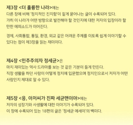 제4장 〈민주주의자 정세균〉은 마치 재미있는 역사 드라마를 보는 것 같은 기분이 들게 만든다. 직장 생활을 하던 사람이 어떻게 정치에 입문했으며 정치인으로서 저자가 어떤 사람인지 제대로 알 수 있다. 제5장 〈응, 아저씨가 진짜 세균맨이야〉에는 저자의 성장기와 사생활에 대한 이야기가 수록되어 있다. 이 장에 수록되어 있는 18편의 글은 ‘정세균 에세이’의 백미다.