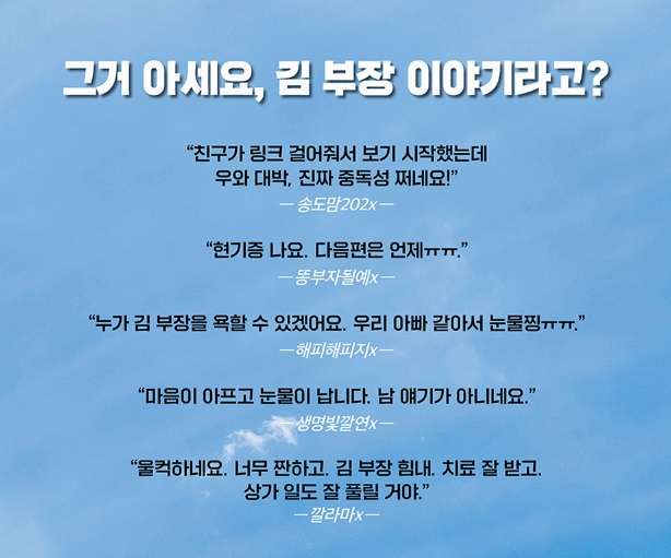 너무 리얼해서 재미있지만, 책장을 덮은 뒤 돌아서서 입안에 도는 맛이 쓴 이유는 단순히 개인의 공감으로 끝나지 않기 때문이다. 어쩌면 현실의 다른 이름이기 때문이고, 모두의 이야기이기 때문이고, 대한민국의 보이지 않는 계급 세계를 본 듯한 허탈감 때문이다. 실제로 이 책의 저자는 “김 부장은 상사 3명의 모습을 합한 인물”이라며 현실의 인물과 실화를 상당 부분 바탕으로 했다고 밝힌 바 있다.