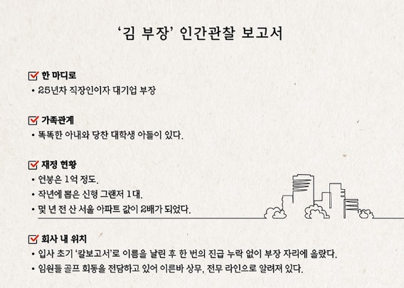 “지금 회사에서 좋은 조건으로 세컨드라이프가 진행되고 있어요. 김 부장님 정도면 위로금 2억이고, 내년이면 위로금이 1억으로 내려가….”