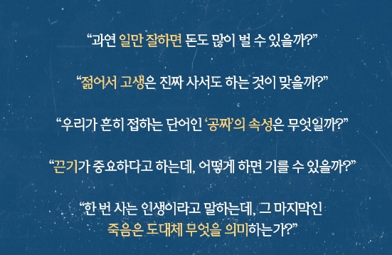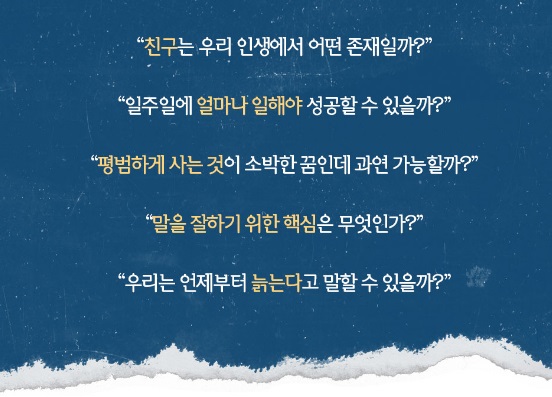 존중 없는 관계는 없다, 가짜 행복에 속고 있는 우리들, 부자들은 저축하는 방법이 다르다, 젊어서 고생은 절대 하지 말아라, 독서, 퇴근 후 진짜 인생을 사는 법, 절대 쉽게 돈을 벌 수 없는 이유, 평생 재수 없게 사는 사람들의 3가지 특징, 진정한 공부란 무엇인가?, 변화