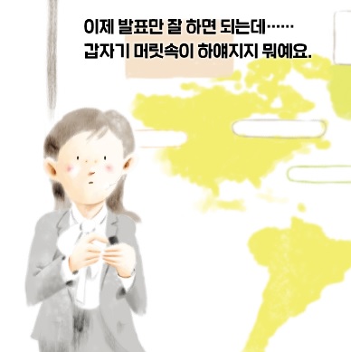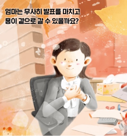그 덕분일까요. 엄마는 오늘따라 모든 일이 술술 잘 풀립니다. 늘 사람들로 북적대는 마을버스와 지하철에서도 편히 앉아 갑니다. 늘 코앞에서 놓치기 일쑤이던 건널목의 파란불과 회사 엘리베이터도 용케 놓치지 않습니다. 급할 때마다 고장 나던 복사기도 오늘따라 쌩쌩 잘 돌아갑니다. 이제 발표만 잘 하면 되는데, 막상 단상에 올라가자 머릿속이 하얘집니다. 엄마는 무사히 발표를 마치고 용이에게 돌아갈 수 있을까요?