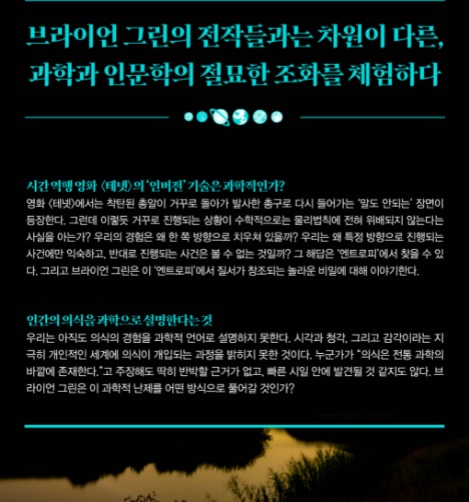 『엔드 오브 타임』은 그의 지난 책들과 결이 조금 다르다. 브라이언 그린 특유의 이해하기 쉬운 문장으로 대중을 향해 강의하듯 특정 물리학 이론을 설명하던 과거 저서들과 비교하면, 이번 책은 독백에 가깝다. 물리학자로서 연구와 탐구를 넘어선, 지난 10여 년간의 철학적 성찰이 느껴진다. 물론 책의 모든 문장은 과학적이고 논리적인 사고를 바탕으로 쓰였다. 다만 그 사고의 방향이 어떤 하나의 과학이론만을 향한 게 아니라 우주와 생명, 인간의 정신에 이르기까지 다방면으로 뻗어 있다는 점이 다르다. 그는 인류가 지금껏 설명해내기 위해 시도해온 수많은 과학적 미스터리들이 여전히 풀리지 않은 채 남아 있다는 사실을 정직하게 밝히면서도, 최선을 다해 문제의 중심으로 파고든다.