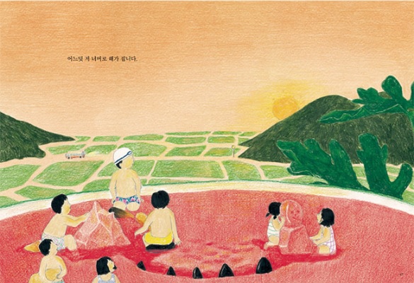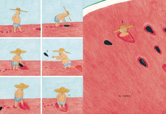 책은 마지막 장면에서 소반 위에 놓인 다 먹은 수박 한 통과 숟가락들을 보여 주면서 사실 ‘수박 수영장’ 이야기는 가족들이 함께 수박을 먹으면서 한 상상이라는 암시를 드러낸다. 이 장면을 보면 가족을 위해 수박 한 통을 사 들고 집으로 돌아왔을 아버지의 모습이 그려진다. 어쩌면 앞두고 있는 여름휴가에서의 물놀이를 기대하고 있는 가족일 수도 있고, 일상에 바빠 여름휴가를 제대로 챙기지 못하는 가족일 수도 있다. 소반에 머리를 맞대고 둘러앉아 수박을 먹으며 여름을 보내는 가족의 모습이 떠올라 마음을 따뜻하게 한다.