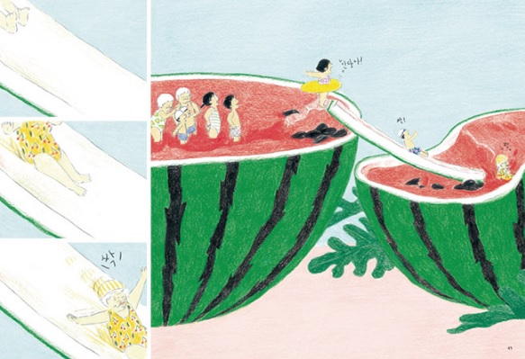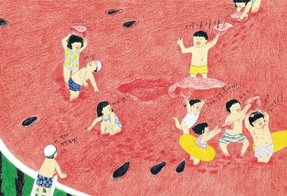 햇볕이 쨍쨍한 무더운 여름날, 시원한 수박 속에 들어가서 논다면 어떨까? 시원하고 호방한 상상을 펼치는 그림책 『수박 수영장』이 출간되었다.