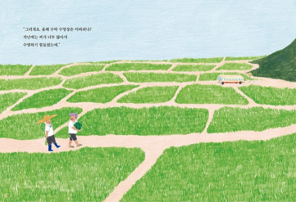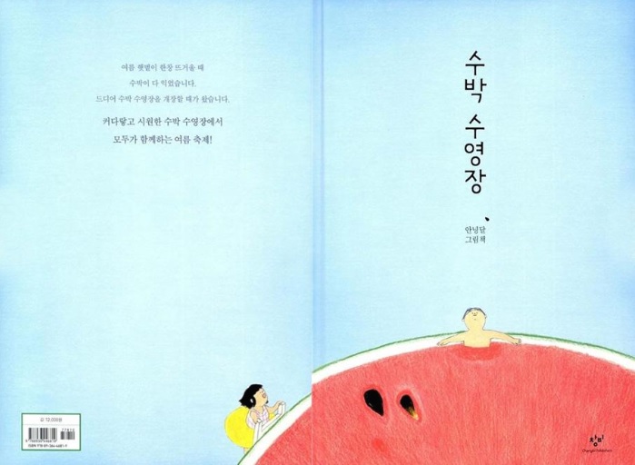 한적한 시골 마을. 해마다 여름 햇볕이 한창 뜨거워지면 ‘수박 수영장’이 개장한다. 엄청나게 큰 수박이 “쩍” 하고 반으로 갈라지면서 온 마을 사람들이 함께 들어가 놀 수 있게 되는 것. 수박 수영장은 모두의 관심거리다. 논일을 하던 아저씨들도, 고무줄놀이를 하던 아이들도, 빨래를 널던 아주머니들도 수박 수영장의 개장 소식을 반긴다. 사람들은 아이 어른 할 것 없이 시원한 수박 속에 들어가 수박 살을 파내고 몸을 담근다. 아이들은 서로에게 수박 살을 던지며 논다. 수박 잎 위에서 다이빙을 하기도 하고, 수박씨와 수박 살로 커다란 조각상을 만들기도 한다. 일상을 잊고 수박 수영장에서 여름을 즐기는 마을 사람들의 모습을 보고 있자면 덩달아 마음이 즐거워지게 된다. 특히 어린 독자들은 수박 수영장에서 붉고 부드러운 수박 살, 검고 둥근 수박씨, 단단하고 매끈한 수박 껍질 등으로 할 수 있는 다양한 놀이를 상상해 보는 것만으로도 즐거움을 느끼기에 충분하다.
